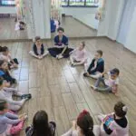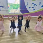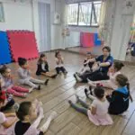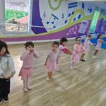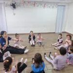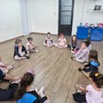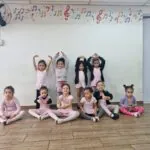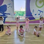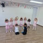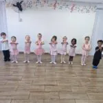 A turminha do Infantil 3 experimenta os primeiros passos de forma lúdica, com atividades que envolvem o demi-plié, relevé, tendu e o passo básico da valsinha, sempre em um clima de brincadeira e imaginação.