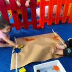 Nossos bebês carimbaram usando esponjas, estimulando a atenção e a percepção sensorial ao explorar as tintas. A figura da galinha colada no escorredor incentivou o encaixe das penas nos buraquinhos, contribuindo para o desenvolvimento da motricidade fina. Já a atividade de retirar os pompons da fita adesiva, explorou a coordenação óculo-manual.