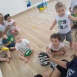As crianças tiveram a oportunidade de fazer novas descobertas e desenvolver autonomia ao retirar os pompons colados na fita adesiva. Aproveitaram também o dia ensolarado brincando na piscina e, ao som de ritmos animados, desfilaram e dançaram com alegria.