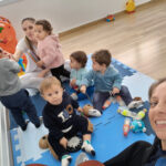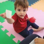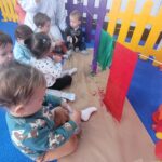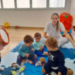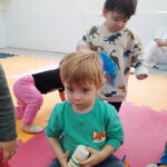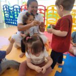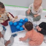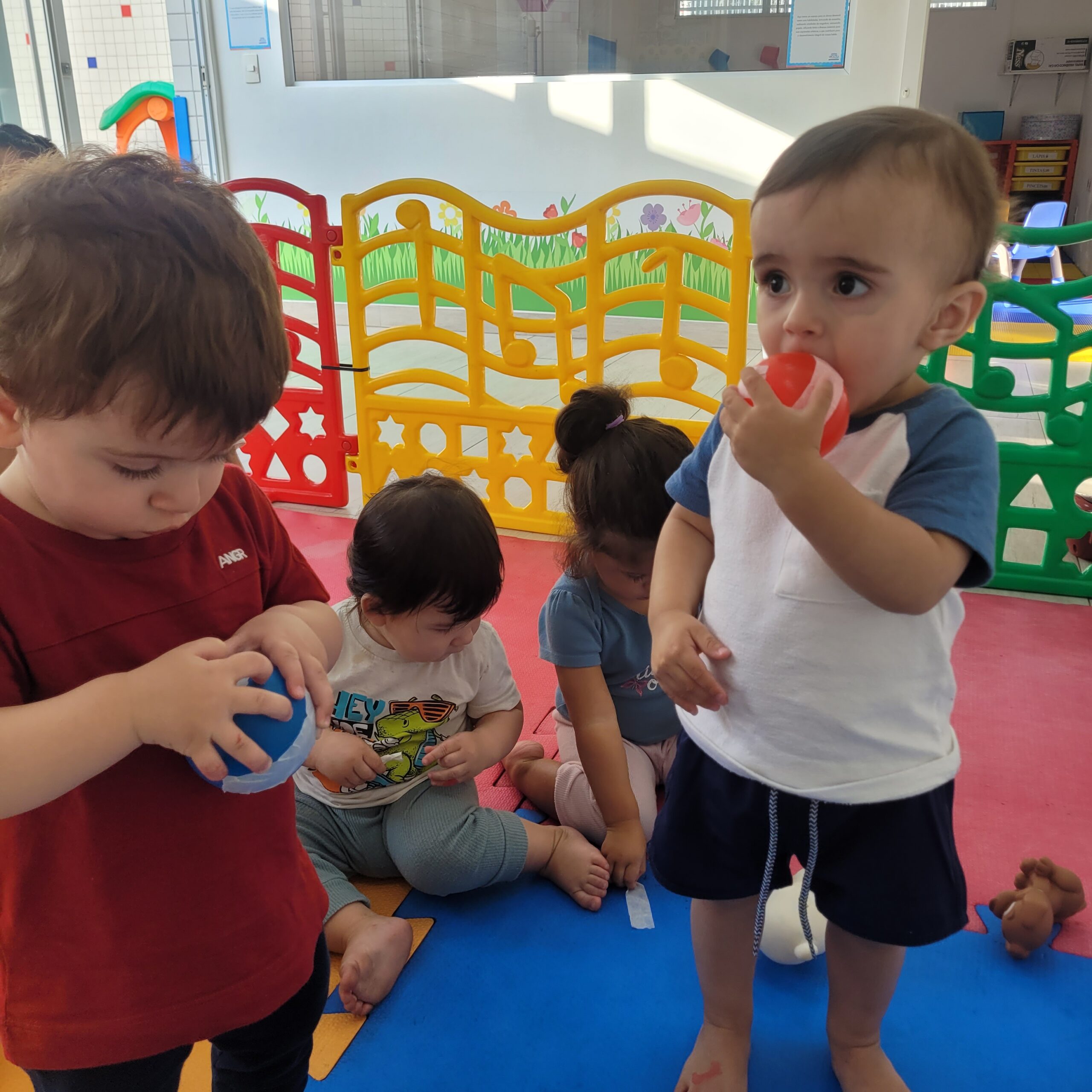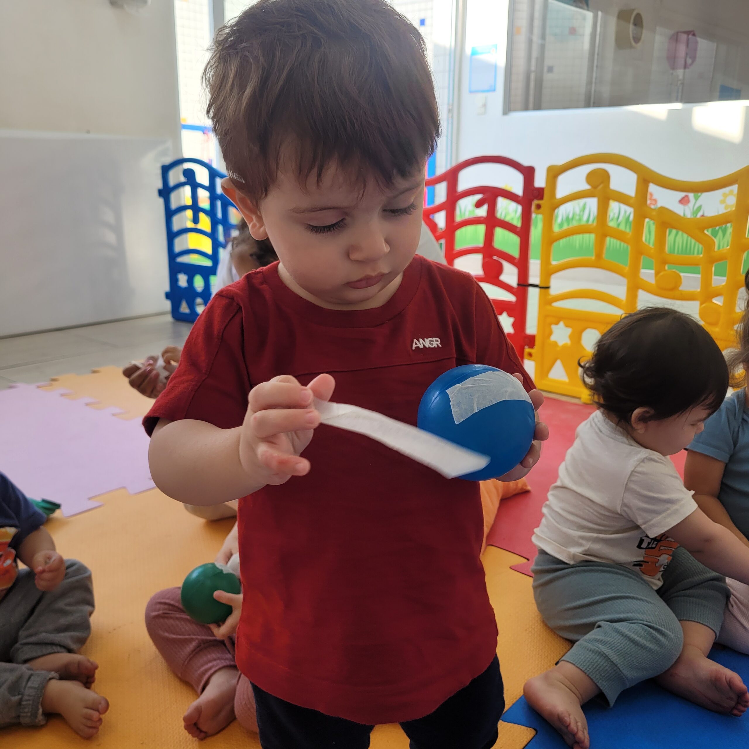 Uma das brincadeiras que mais chamou a atenção do bebês foi retirar as fitinhas coladas nas bolinhas, um desafio que envolveu atenção, movimento e muitas risadas! Durante a atividade, fomos nomeando as cores em inglês, como blue, red e yellow, incentivando os primeiros passinhos na nova língua.
