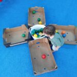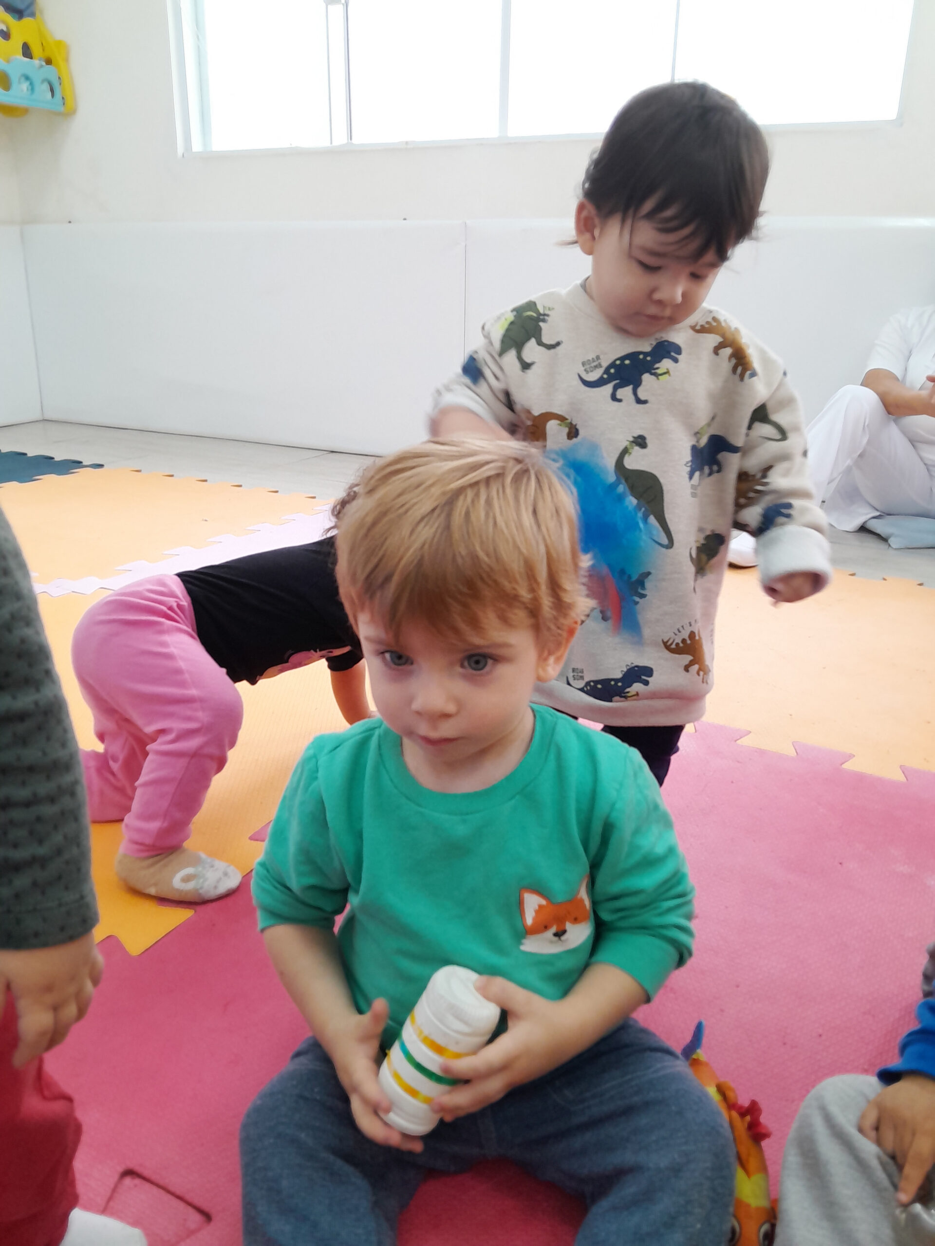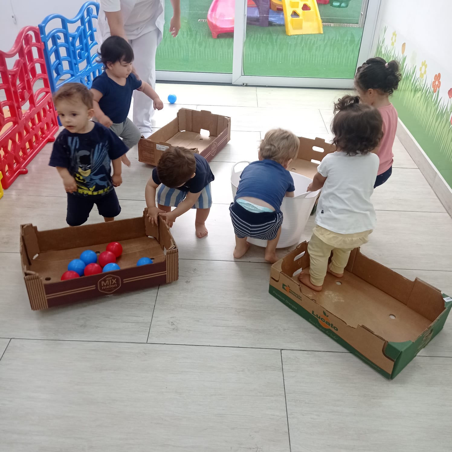 As atividades e brincadeiras exploradas pela turminha do BII foram repletas de descobertas por meio da exploração de materiais variados. Nossos pequenos rabiscaram, dentro de uma caixa em movimento, o papel fixado na parede e divertiram-se ao colocar bolinhas coloridas nas caixas, pareando as cores.