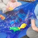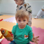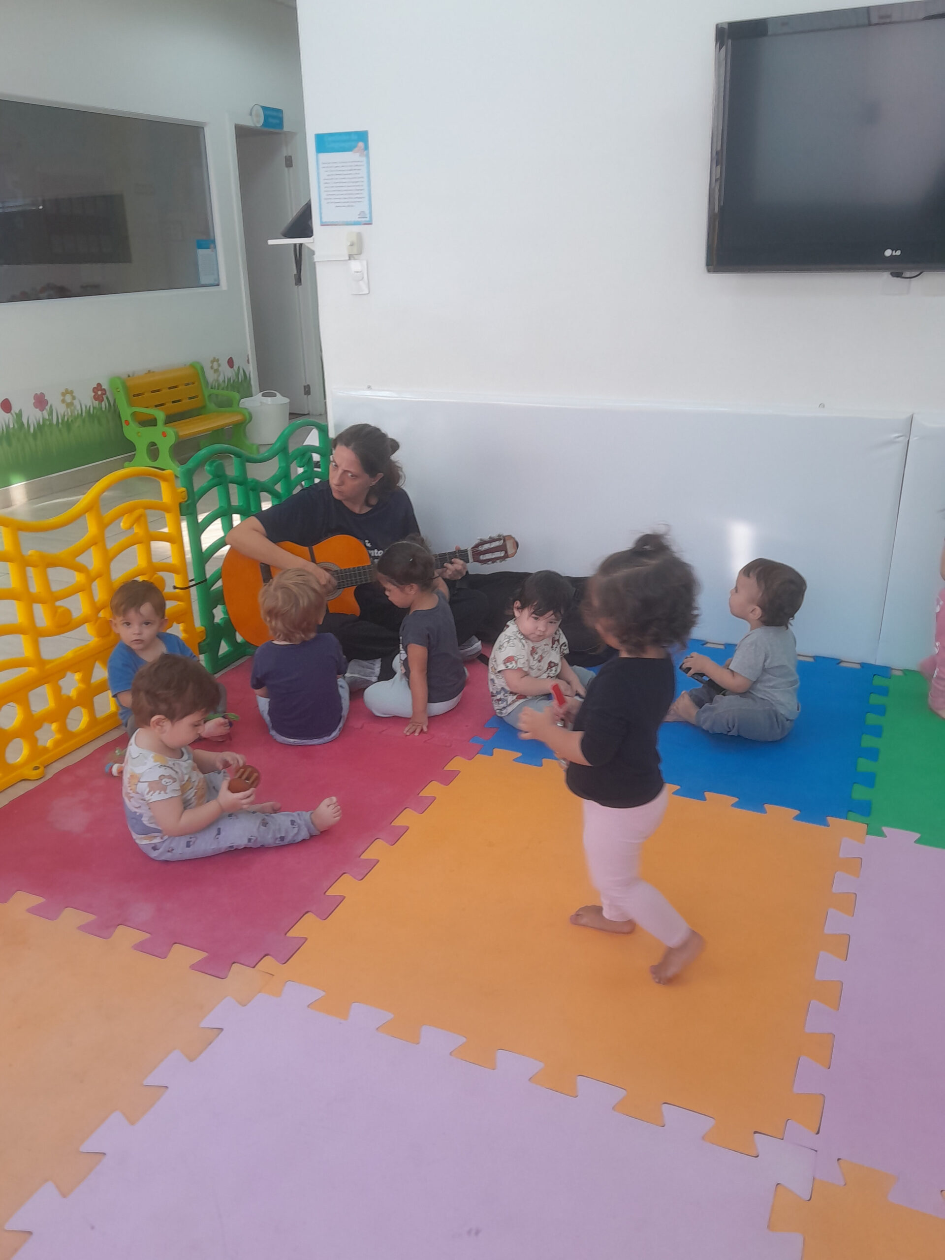 Com a música “Peixe no Lago”, brincamos com o movimento do chocalho em formato de peixe, o som do papel celofane imitando a água e ainda compartilhamos o brinquedo, permitindo que cada amigo tivesse a oportunidade de brincar.