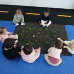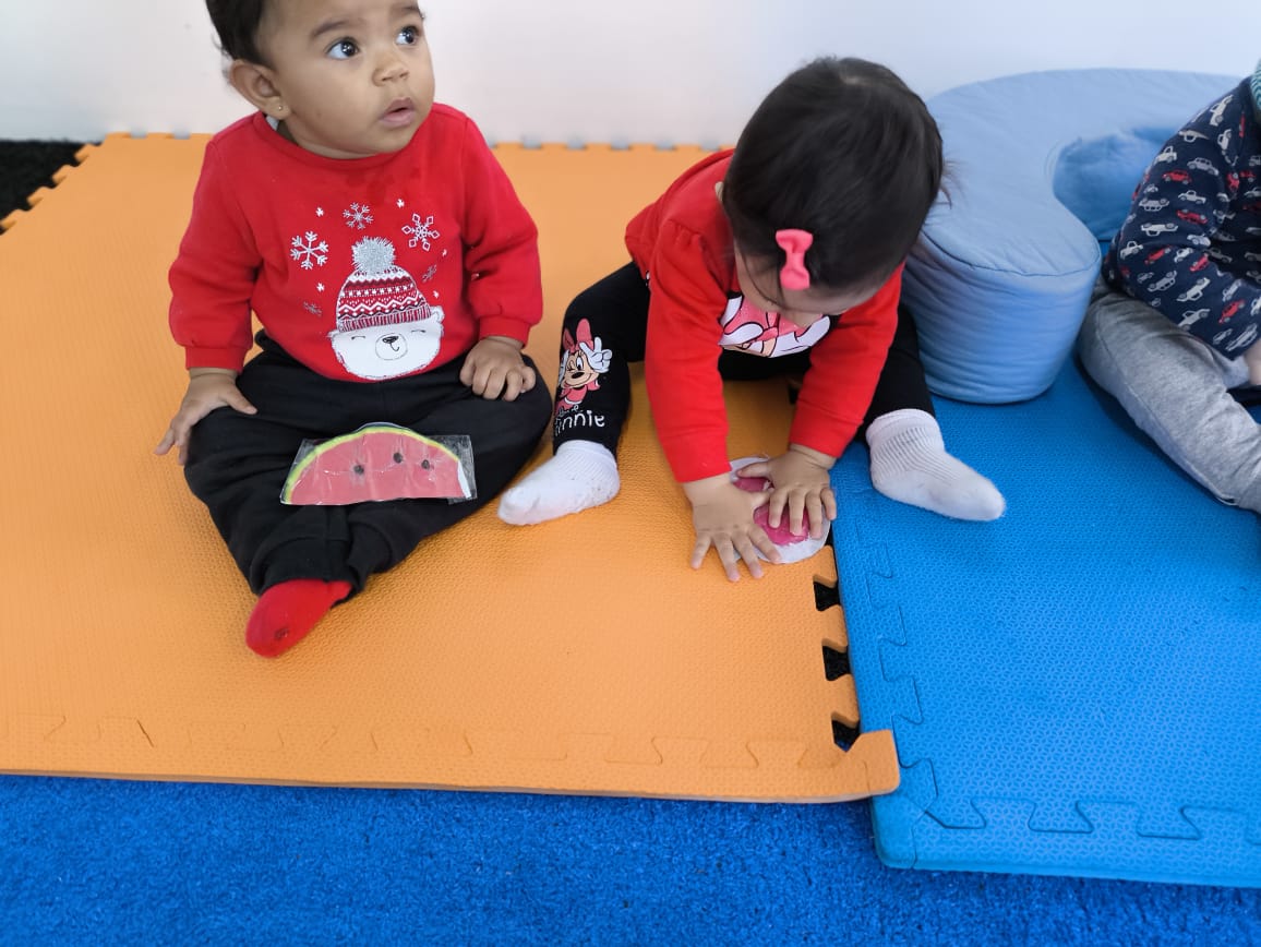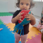 Ao longo do mês, os bebês do BI foram convidados a explorar o mundo ao seu redor por meio de brincadeiras e atividades envolventes. No recipiente com areia e bolinhas coloridas, manusearam os materiais, observando suas cores e movimentos com atenção. Com as figuras de frutas contendo sementes e cascas, descobriram novas texturas, ampliando sua percepção sensorial.