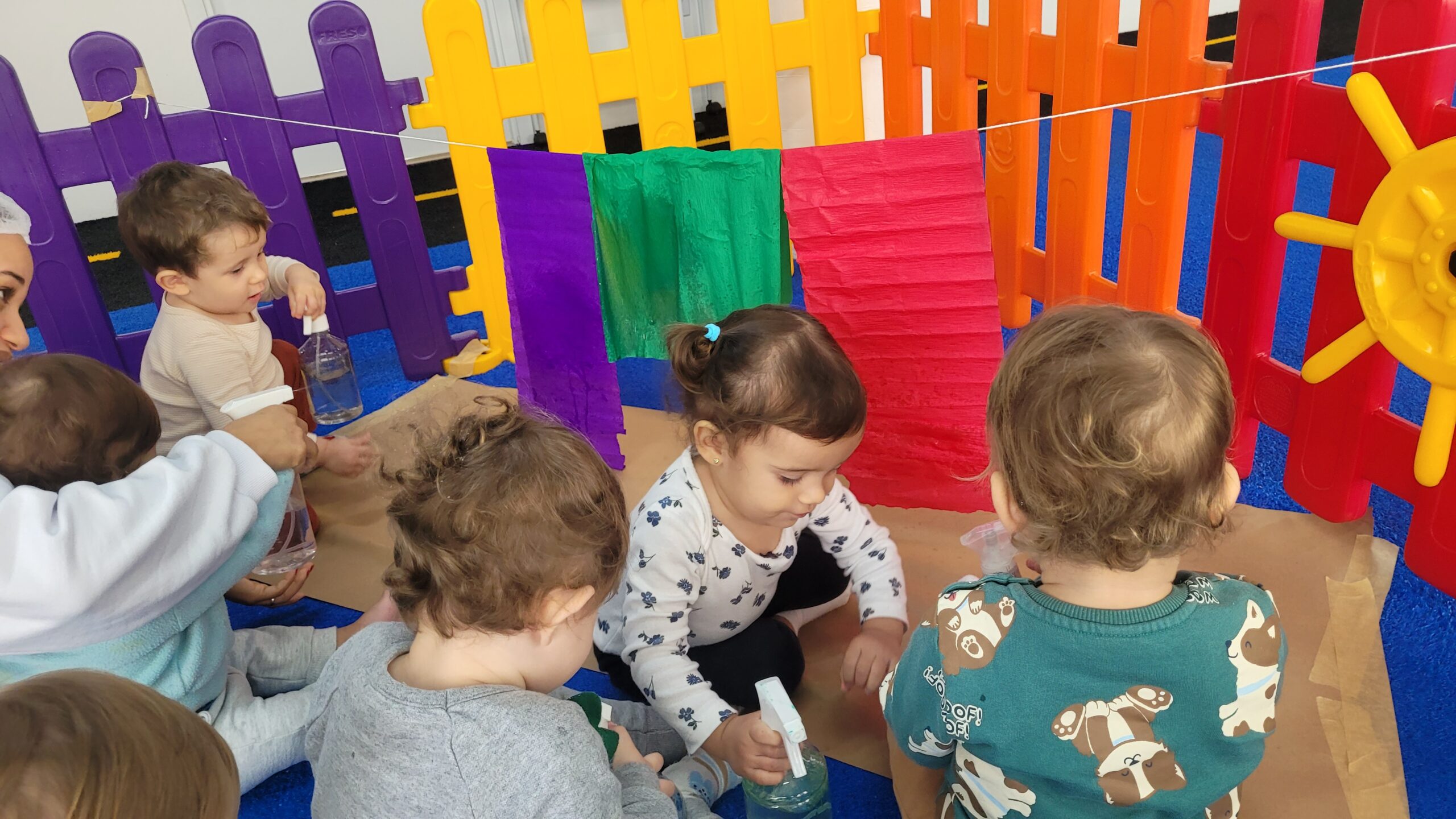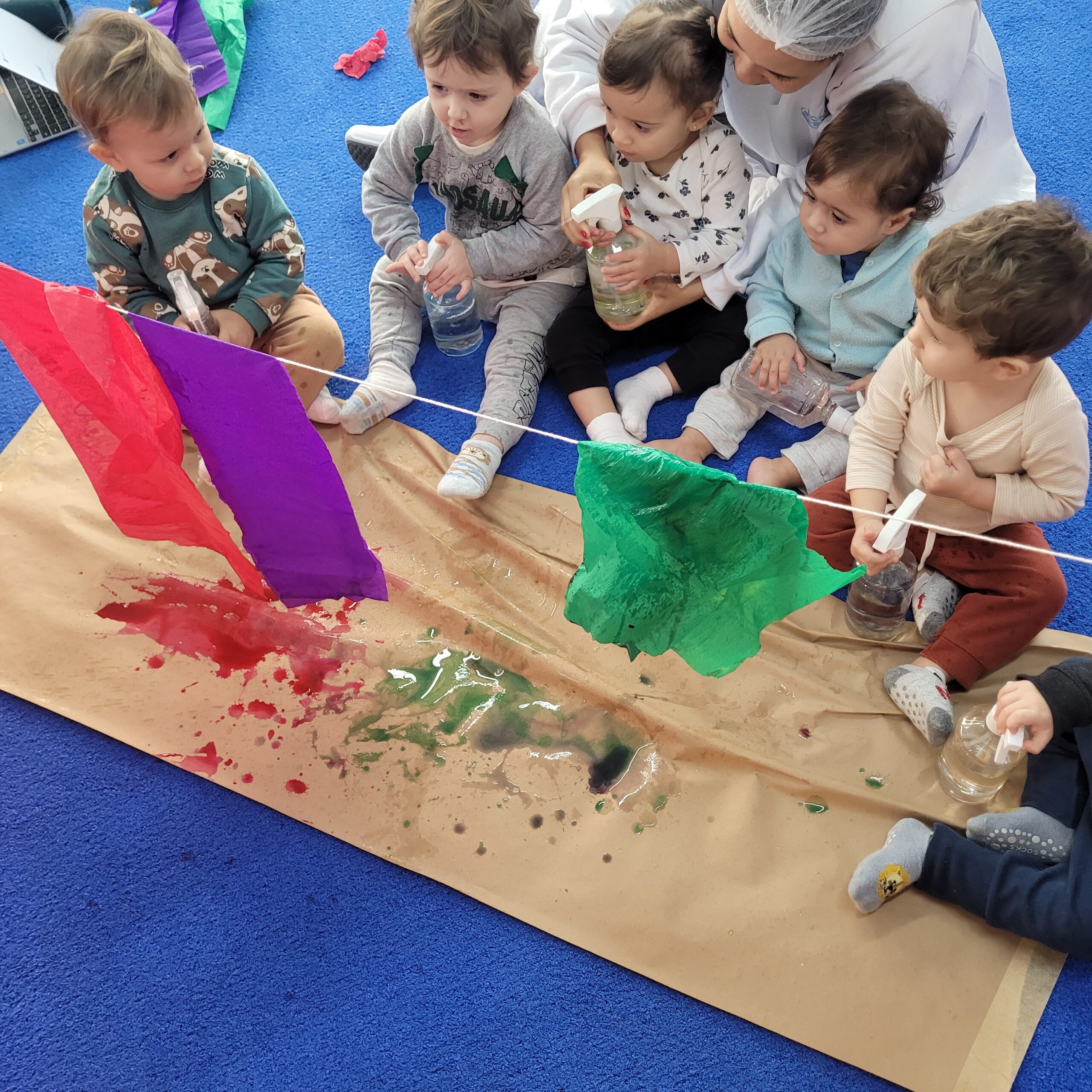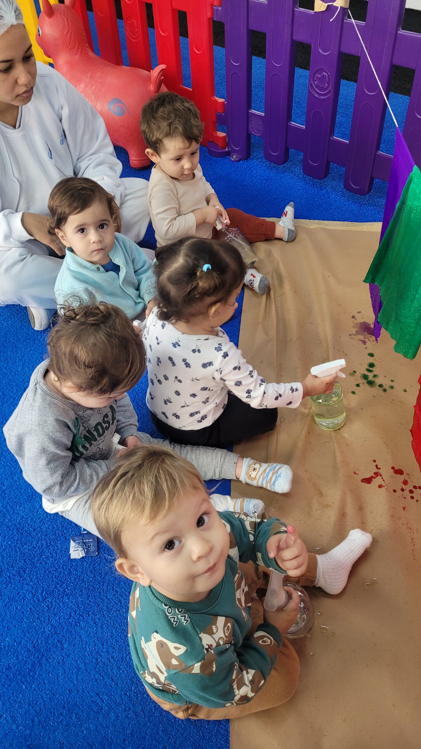 Também vivenciamos momentos encantadores de pintura com balões presos em fitas, convidando os bebês a explorar novas formas de expressão. Para finalizar, espalhamos cores com spray sobre o papel crepom, criando efeitos mágicos que despertaram olhares curiosos e muitas mãozinhas animadas! Com afeto e muita alegria, seguimos aprendendo juntos, dia após dia.