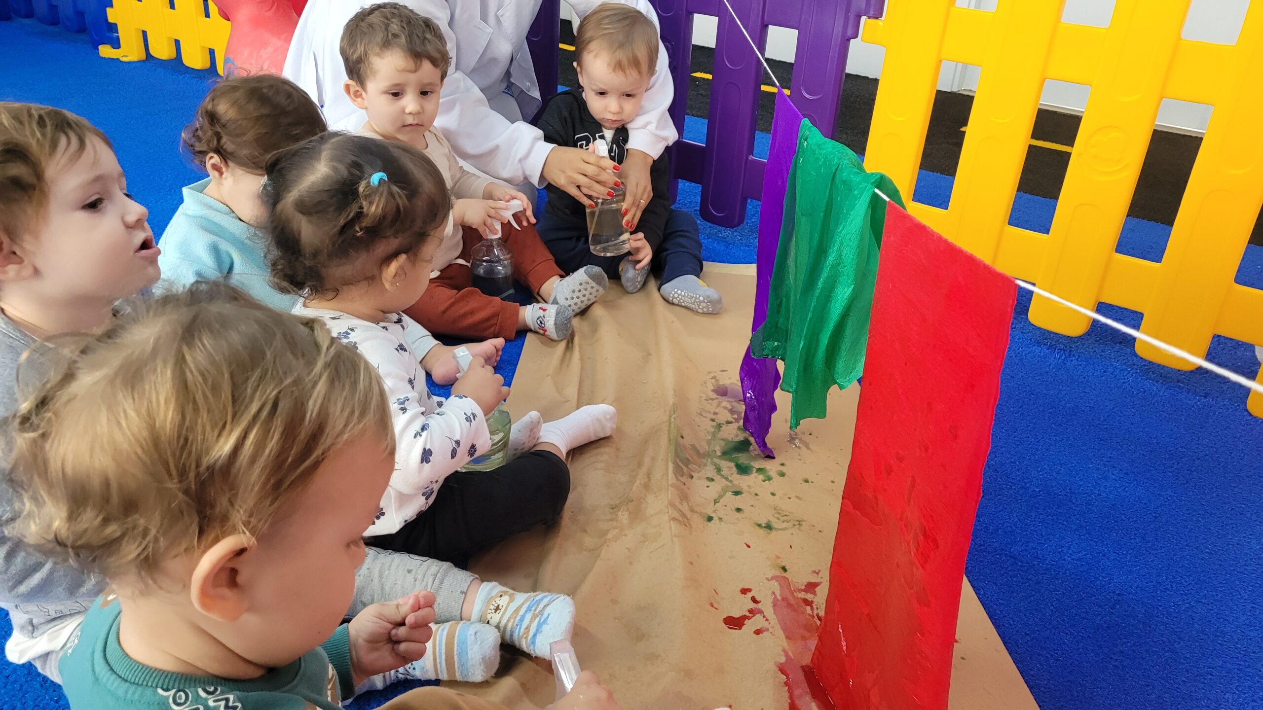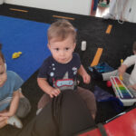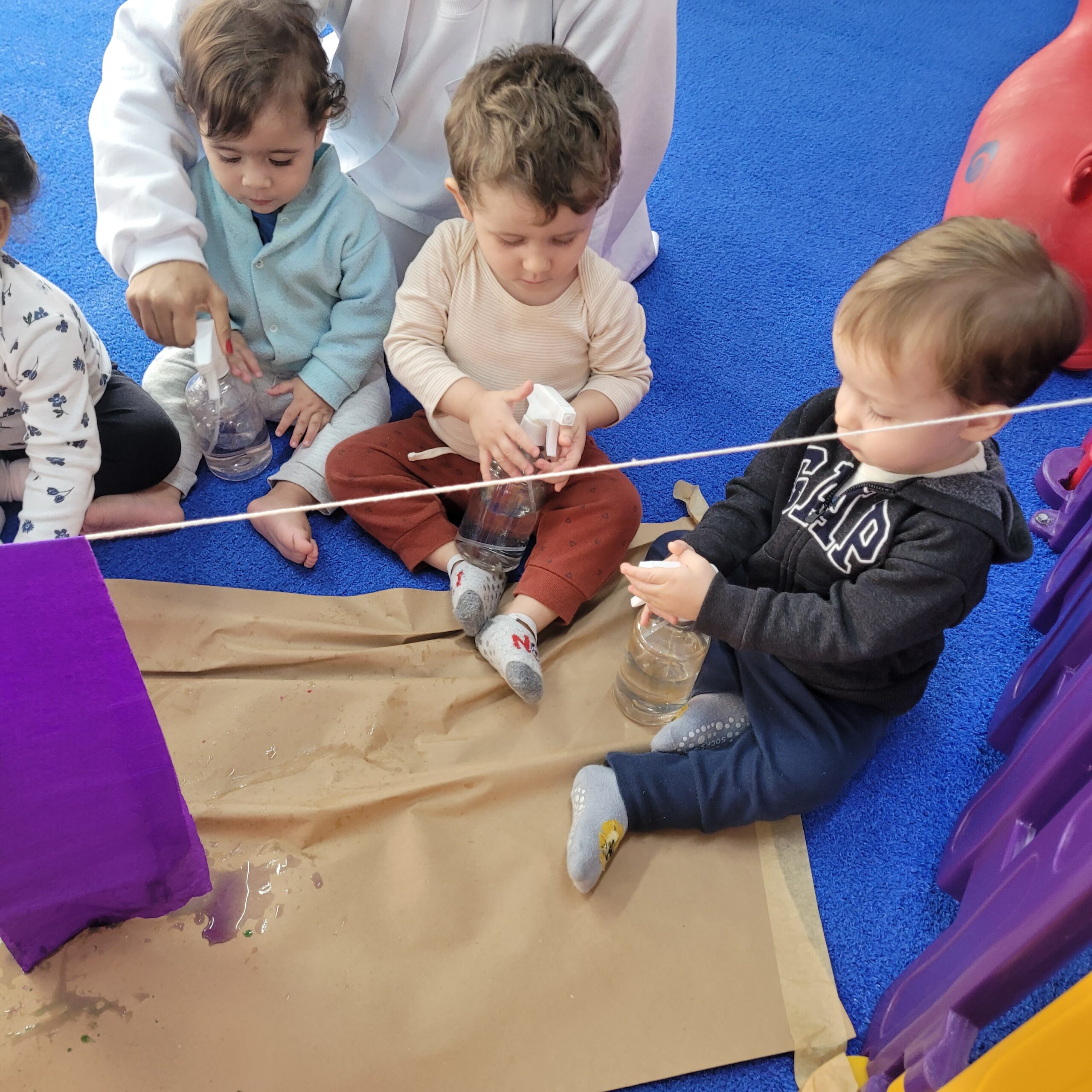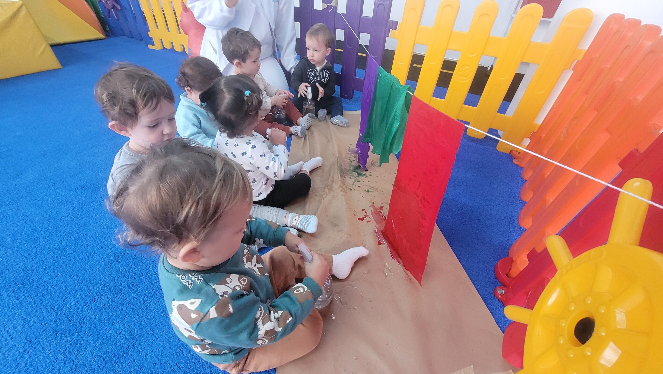 Também vivenciamos momentos encantadores de pintura com balões presos em fitas, convidando os bebês a explorar novas formas de expressão. Para finalizar, espalhamos cores com spray sobre o papel crepom, criando efeitos mágicos que despertaram olhares curiosos e muitas mãozinhas animadas! Com afeto e muita alegria, seguimos aprendendo juntos, dia após dia.