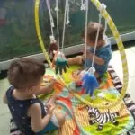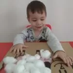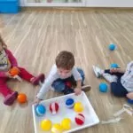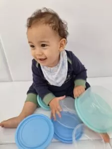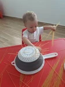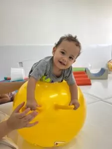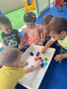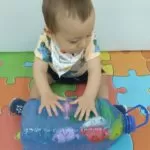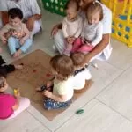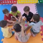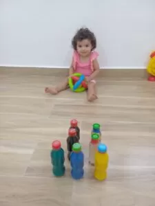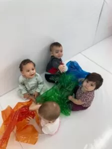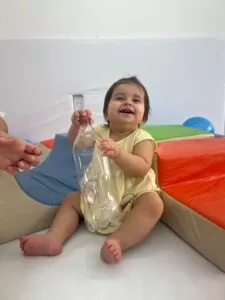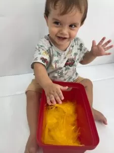 Abriram e fecharam potes plásticos, brincaram com tampinhas coloridas da garrafa pet, exploraram os espaguetes de espuma, brincaram com o pano encantado ao som da música “O Pano Encantado” de Lu Chamusca, colaram e descolaram bolinhas, fizeram uma torre de copos e depois derrubaram, pegaram argolas na farinha de trigo, exploraram o tapete sensorial, descolaram o palito de sorvete do recipiente, puxaram as fitas de cetim que estavam na parede, se divertiram com a caixa de objetos e brincaram com o cavalinho upa upa.