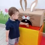 Brincaram com o aquário cheio de peixinhos dentro do garrafão de água, manusearam as luvas cheias d’água, colaram folhas secas na figura da árvore, encaixaram bolinhas coloridas no varal dos baldinhos, os ovinhos na forma de silicone. Brincaram de abrir e fechar as tampinhas da caixa de rosquear, alimentaram o coelhinho com a cenoura.
