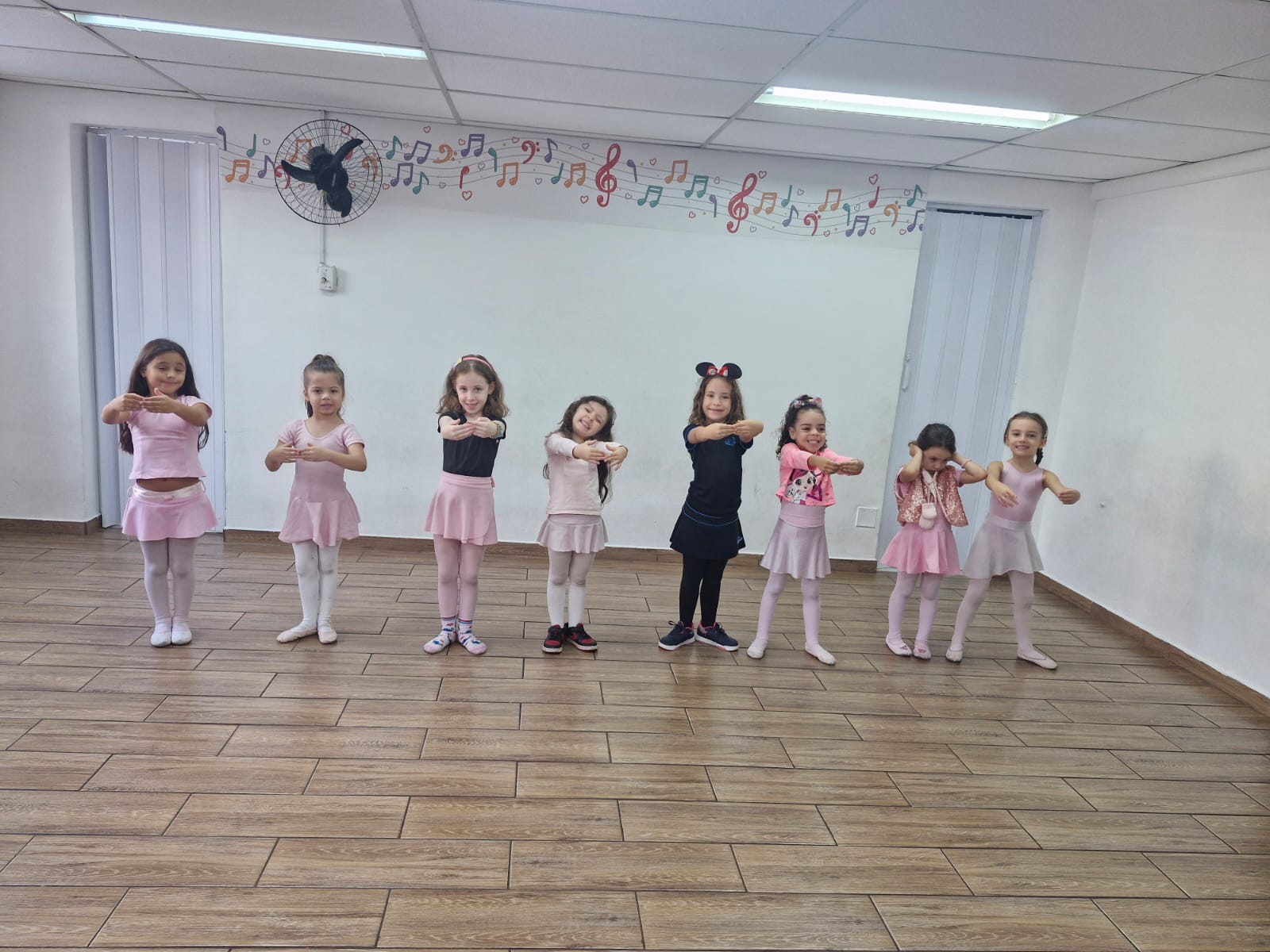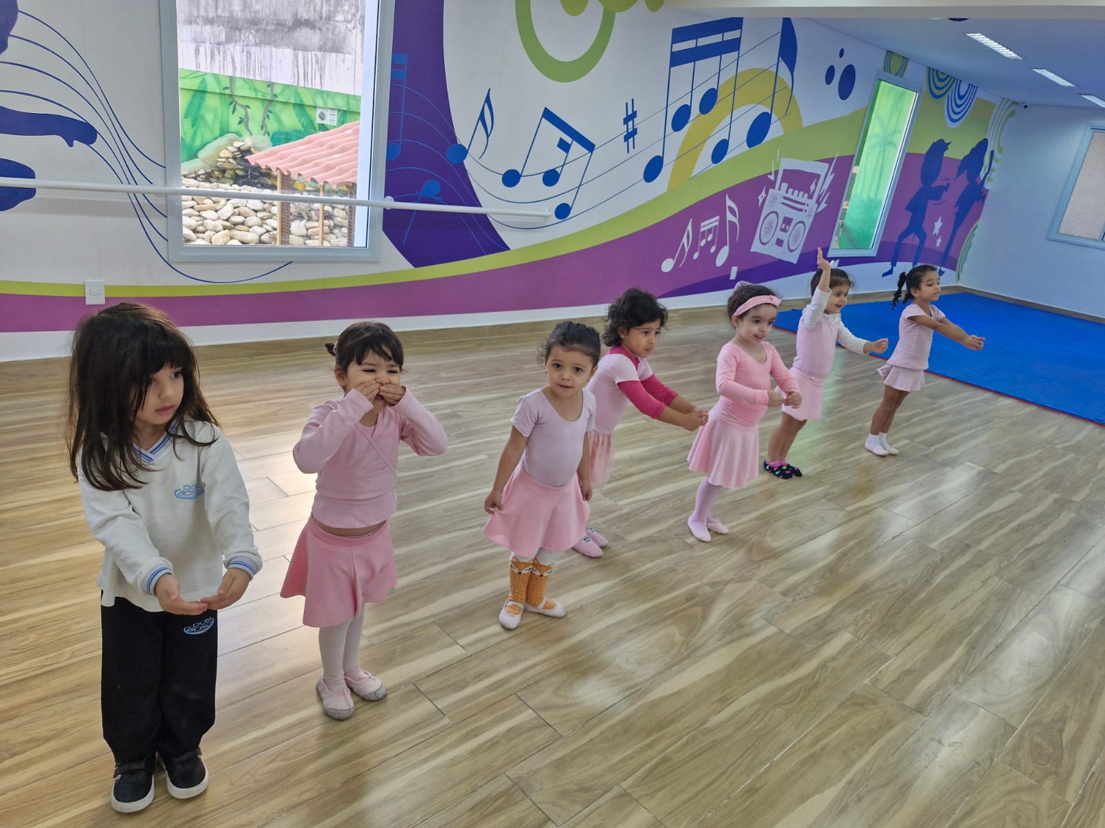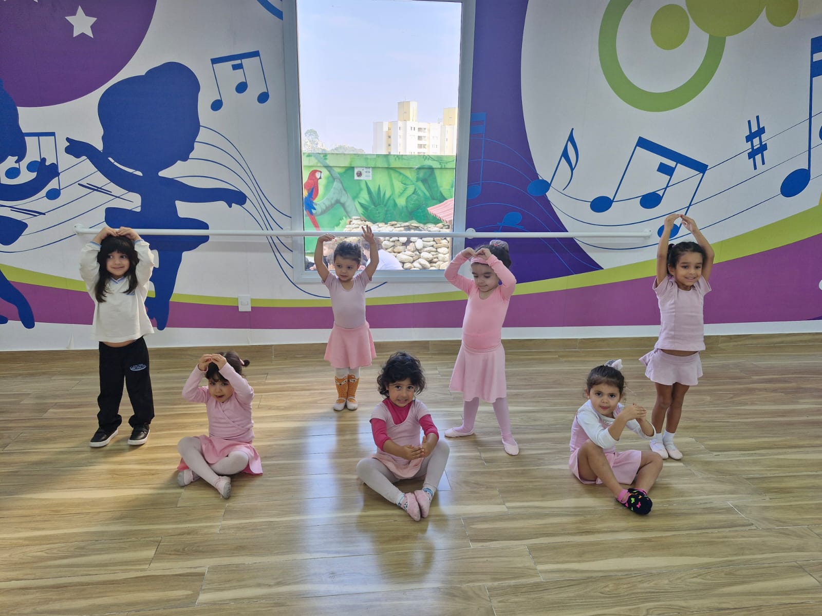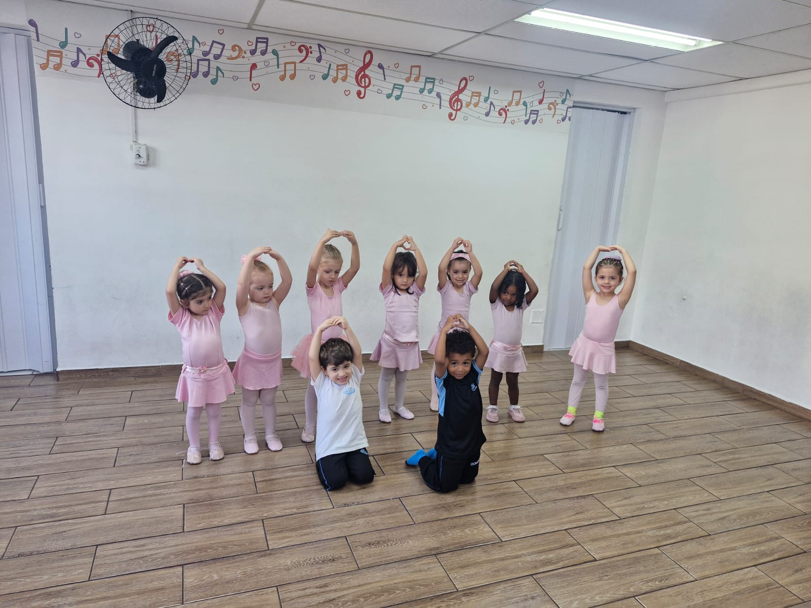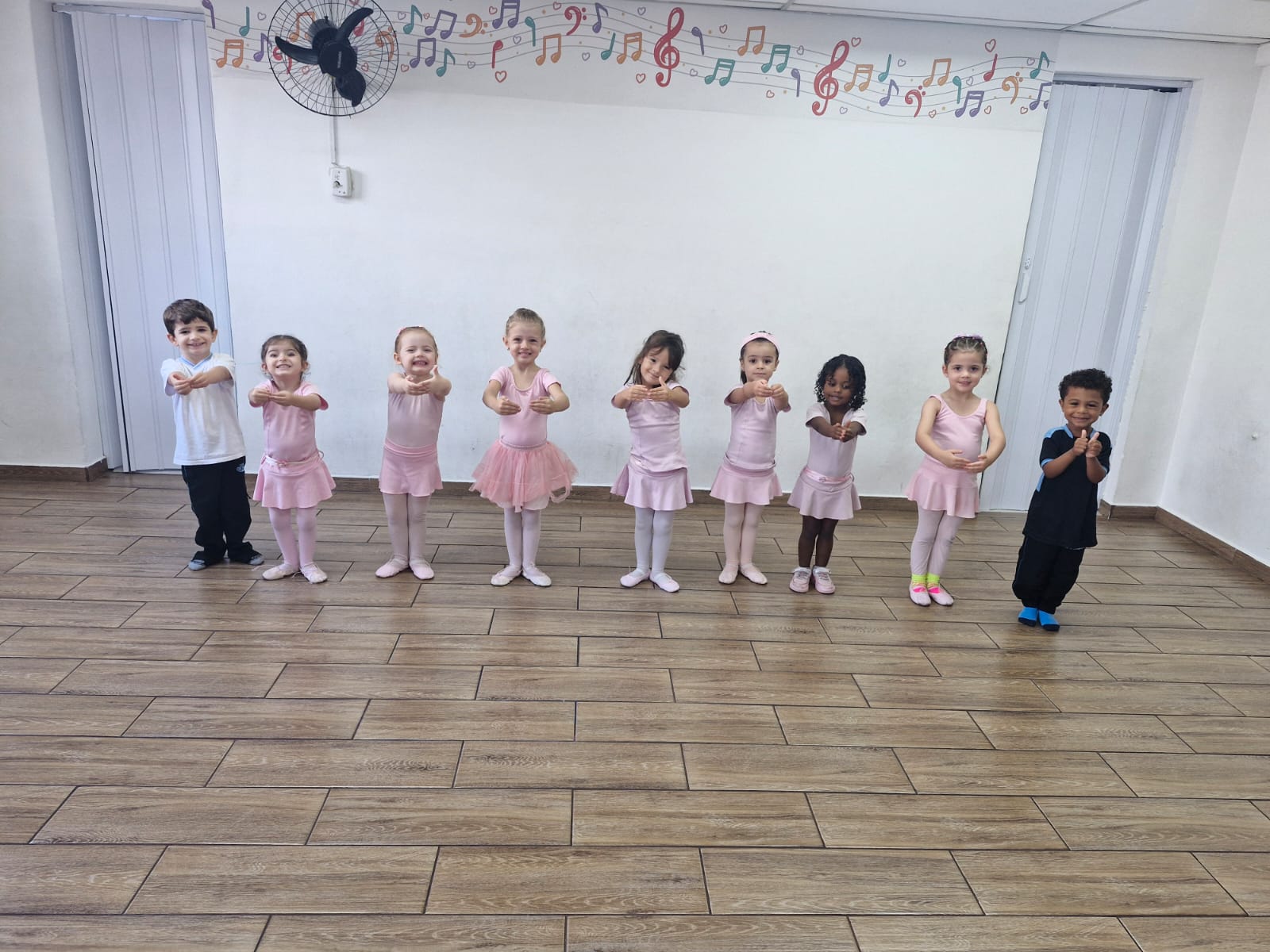 A turminha do Infantil 3 experimenta os primeiros passos de forma lúdica, com atividades que envolvem o demi-plié, relevé, tendu e o passo básico da valsinha, sempre em um clima de brincadeira e imaginação.
