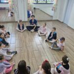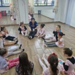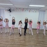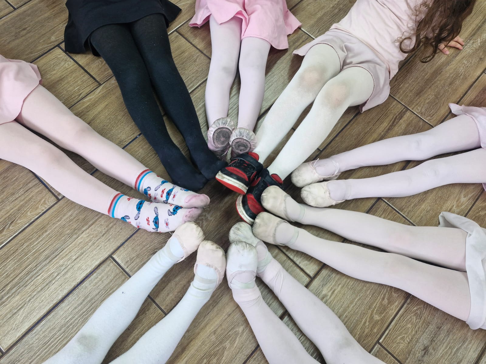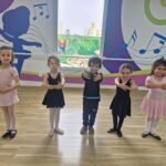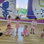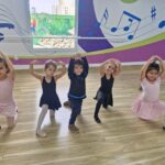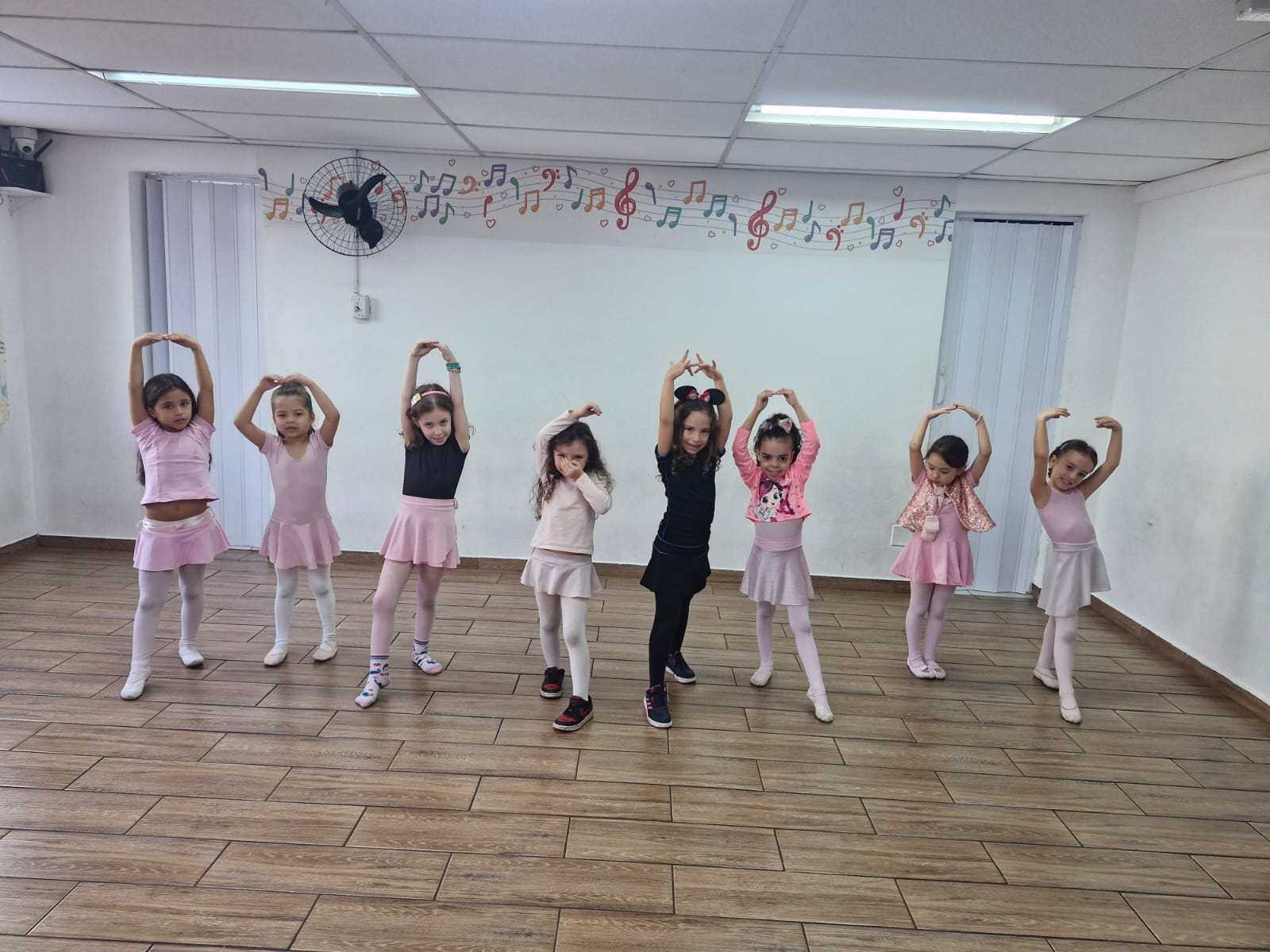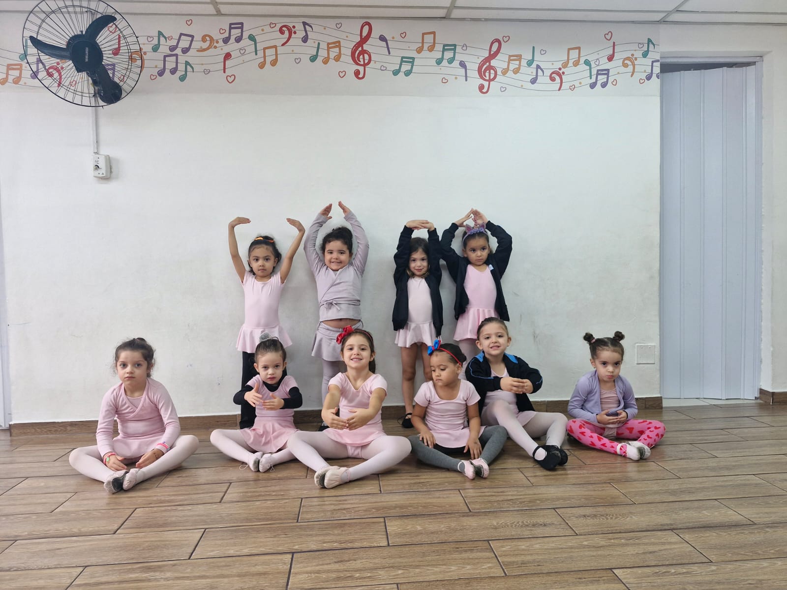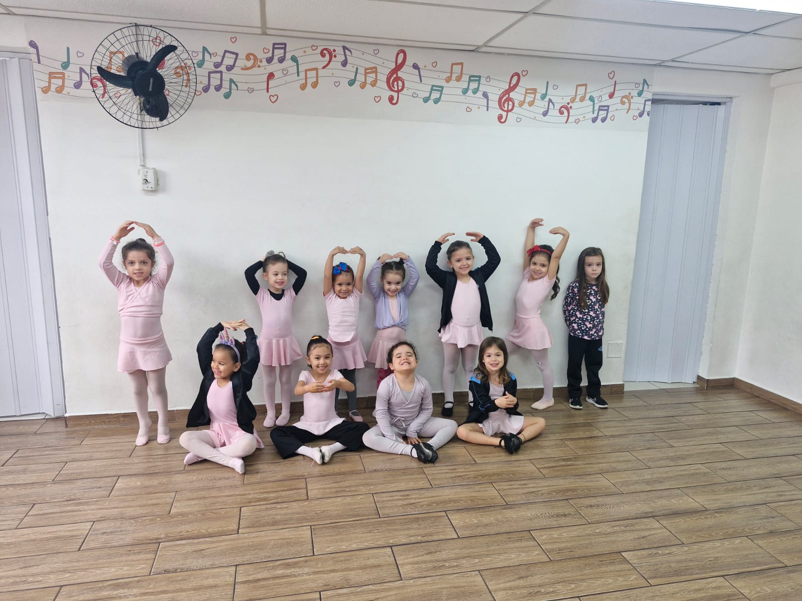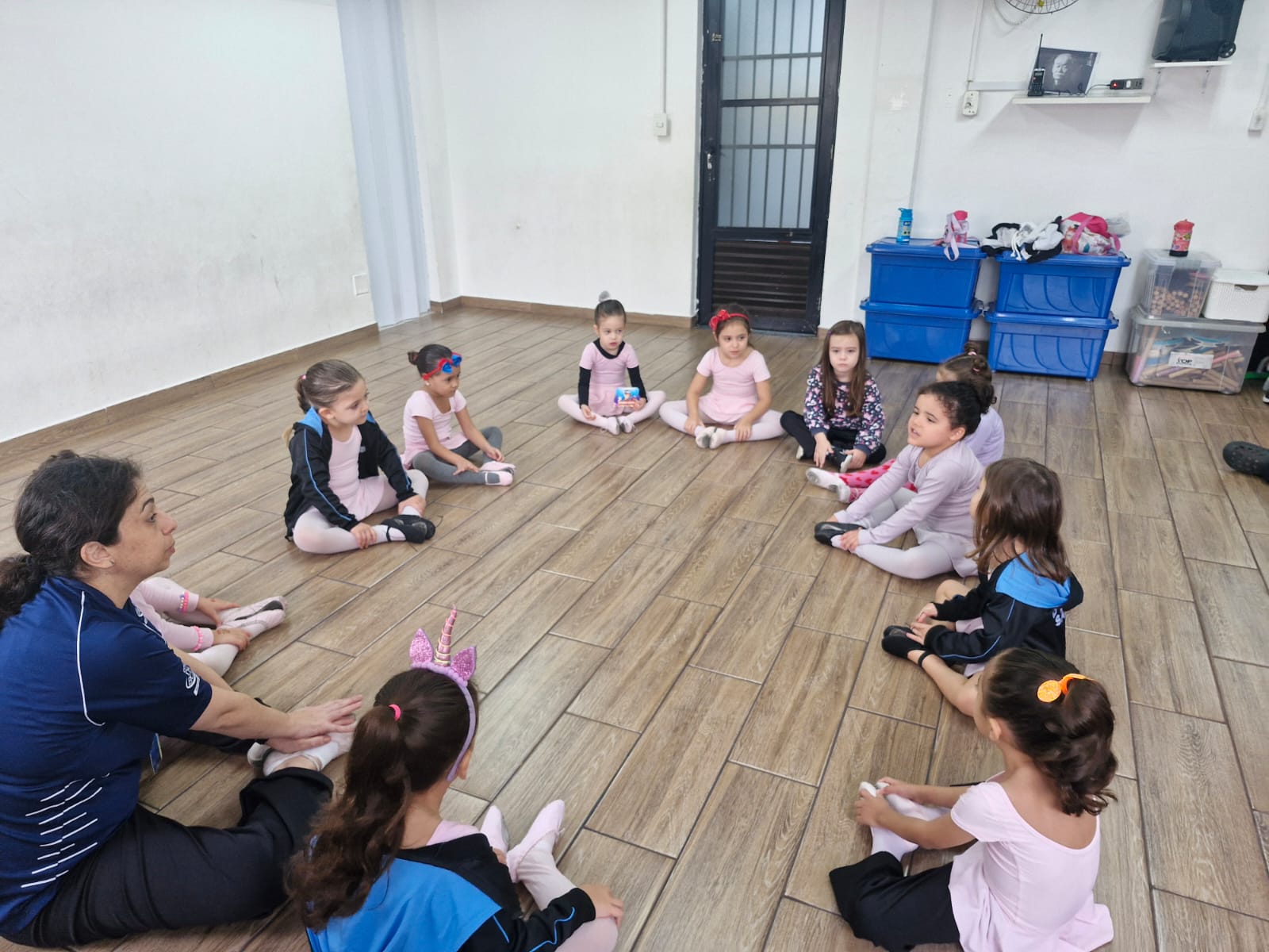 A turminha do Infantil 3 experimenta os primeiros passos de forma lúdica, com atividades que envolvem o demi-plié, relevé, tendu e o passo básico da valsinha, sempre em um clima de brincadeira e imaginação.