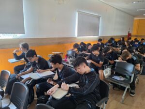 No 9º ano, trabalhamos com o material LIV, o projeto “Deu match” e a série “Elos”, abordando as relações dos alunos com a tecnologia e
