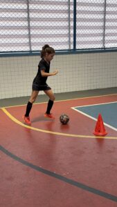 Menina conduz bola de futsal entre cones durante treino na quadra do Colégio Dom Bosco