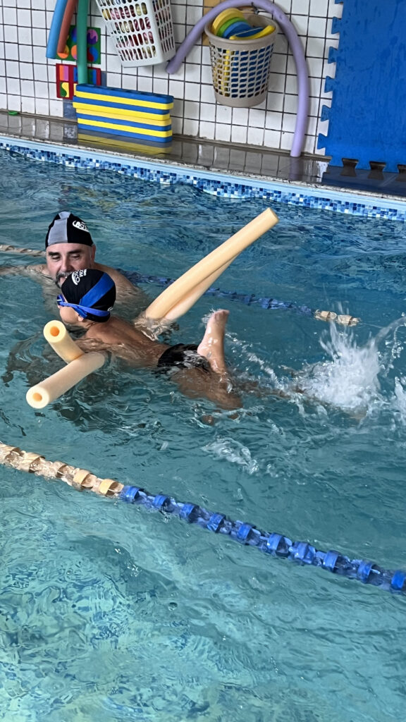 O menino, usando touca e óculos de natação com a marca do colégio, está em posição de nado com auxílio de espaguetes flutuantes. A atividade ocorre em uma piscina interna, com azulejos decorativos ao fundo e materiais pedagógicos organizados em cestos. O ambiente é seguro e supervisionado, ideal para o aprendizado das técnicas básicas de natação e o desenvolvimento motor infantil.