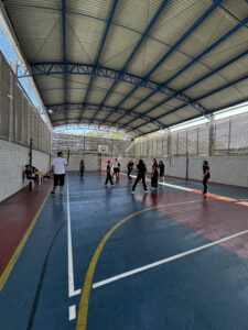 Alunos jogam vôlei em quadra coberta durante aula no Colégio Dom Bosco