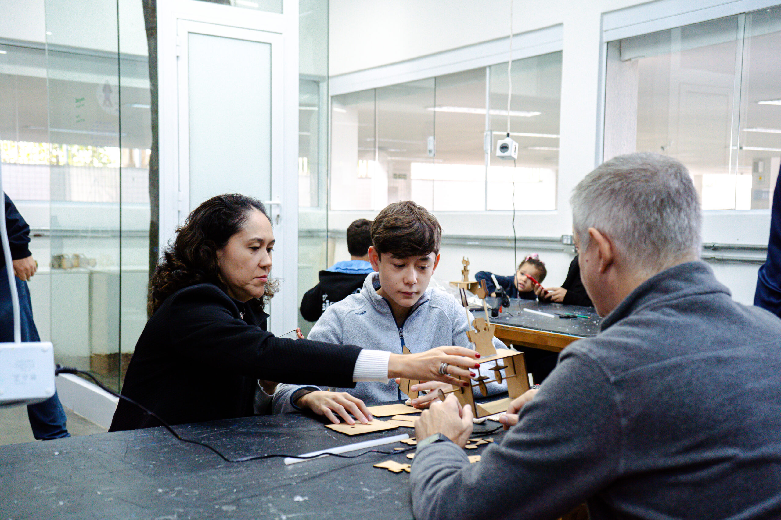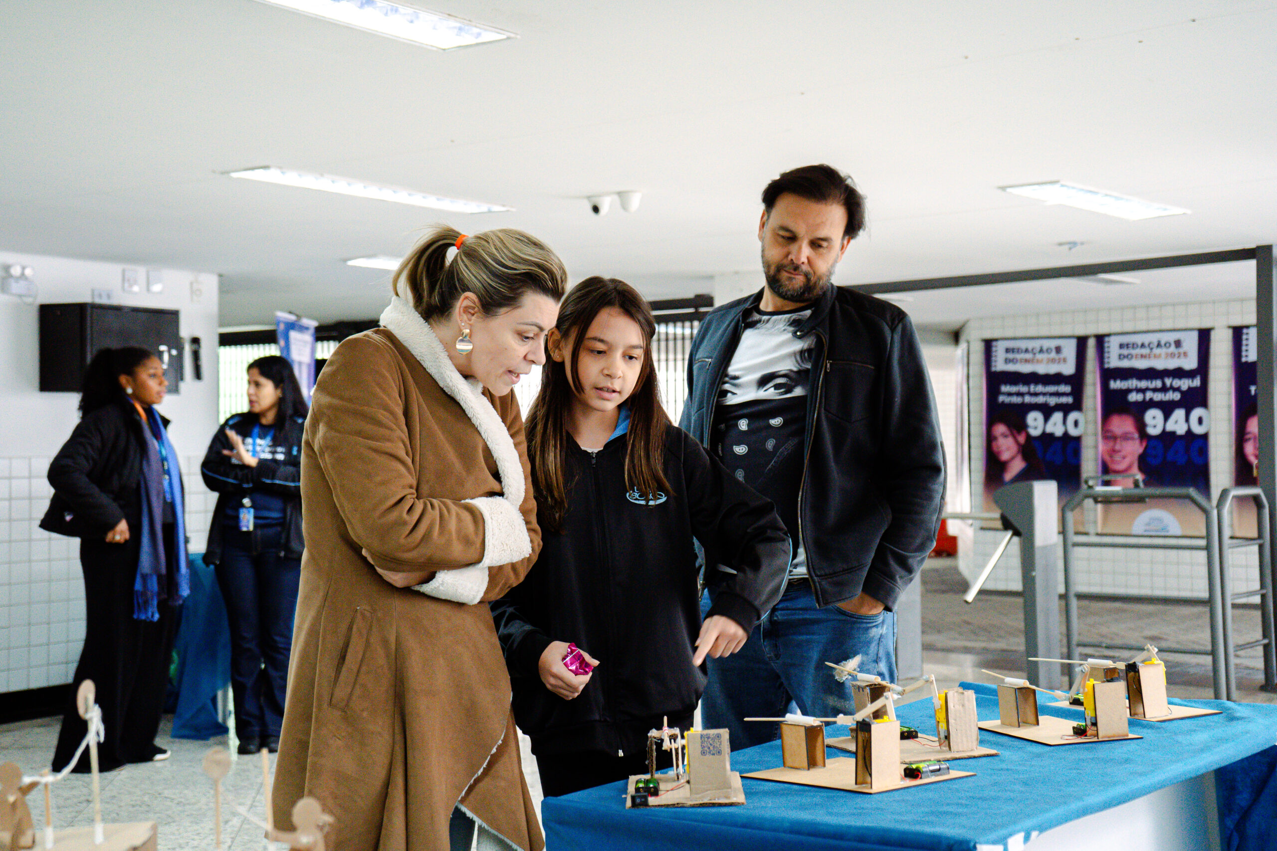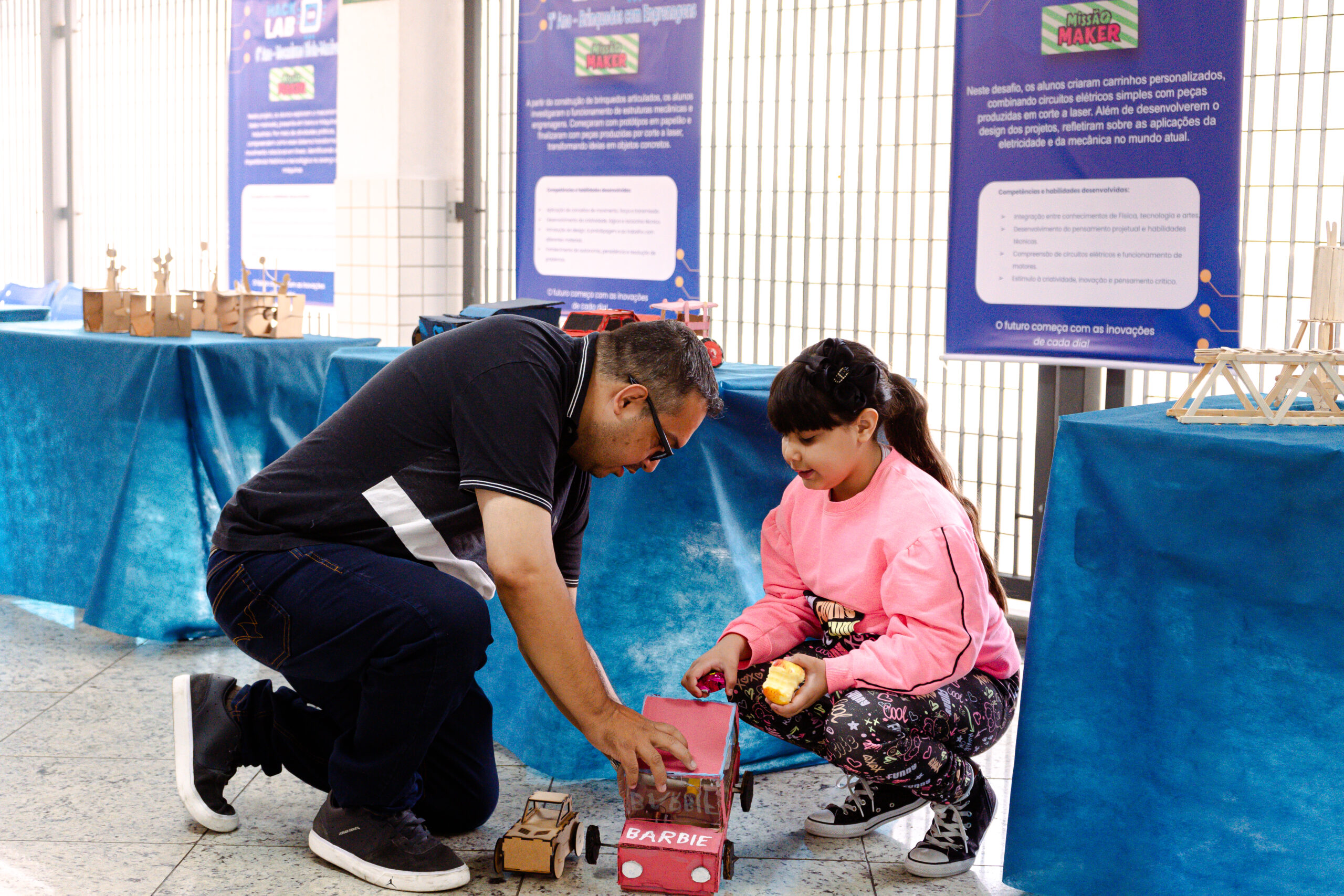 Durante o HackLab, as famílias puderam conhecer os trabalhos realizados pelos alunos e as diversas temáticas abordadas, como sustentabilidade, tecnologia, bem-estar e soluções para o dia a dia.