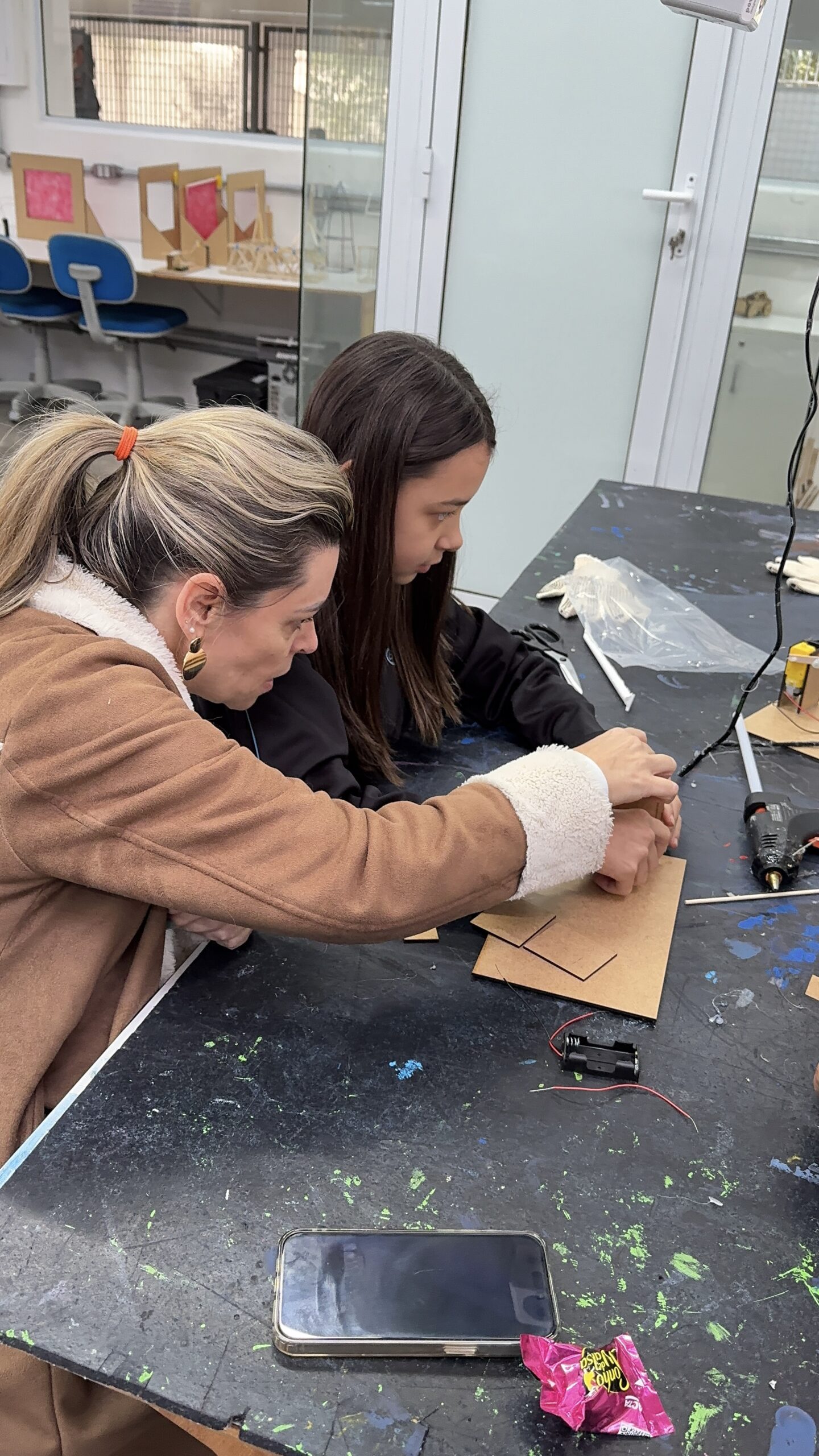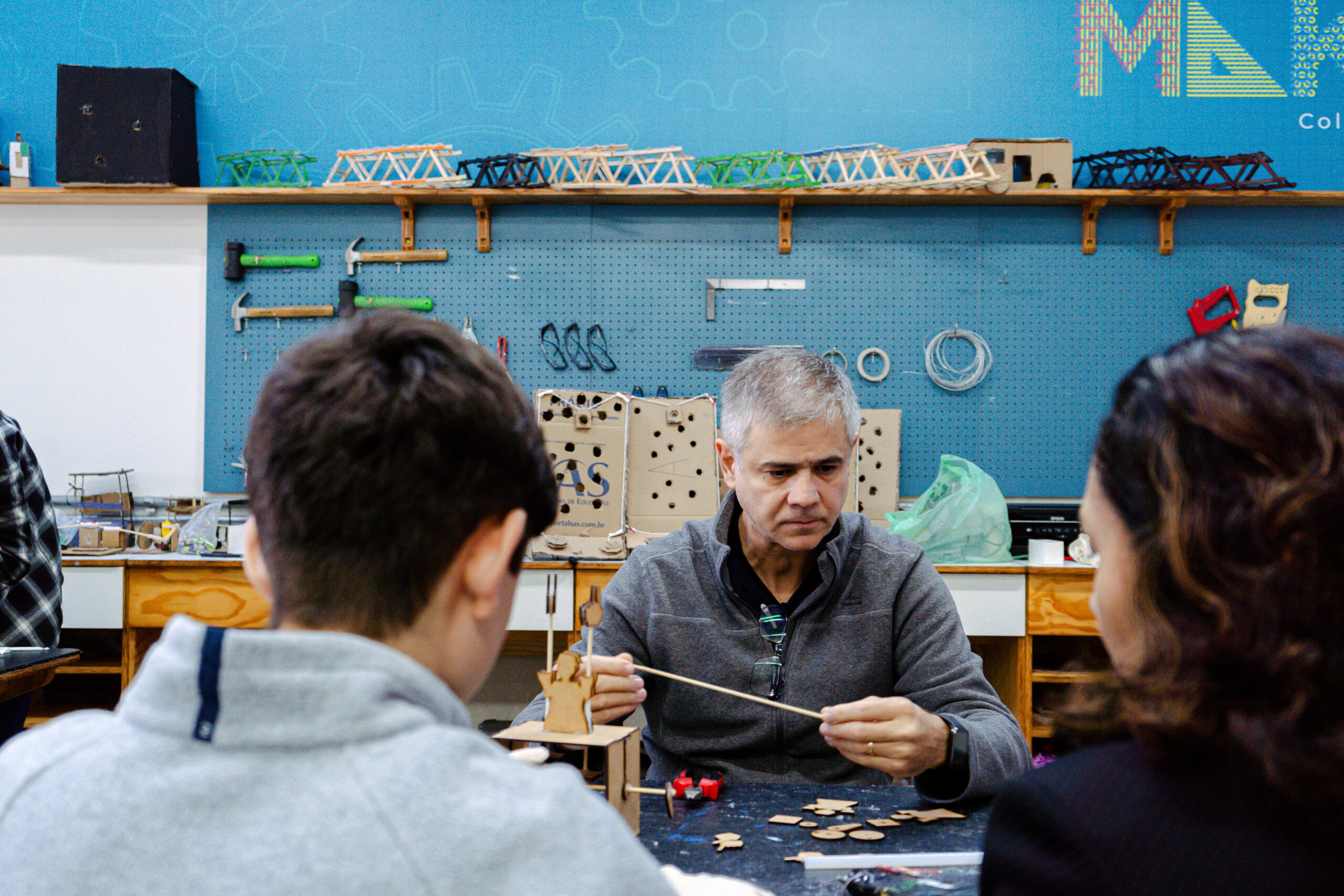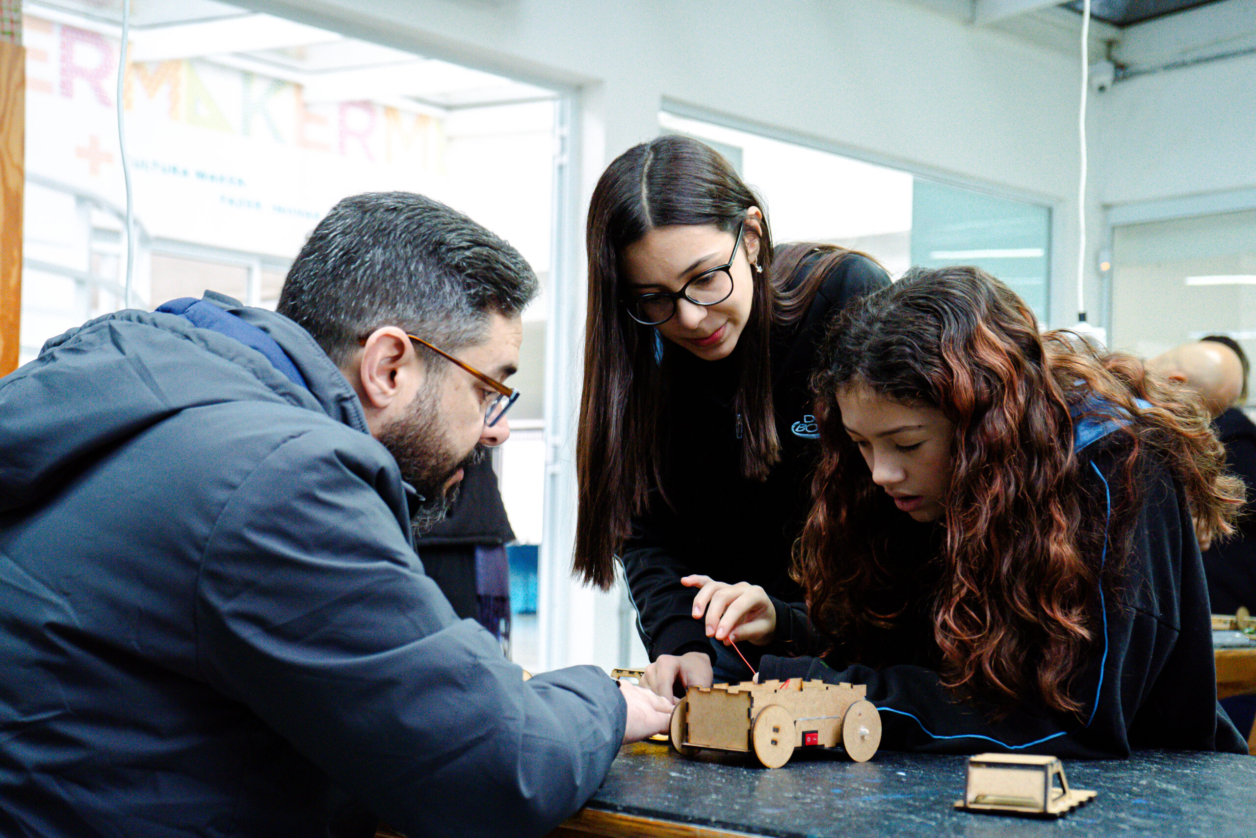Durante o HackLab, as famílias puderam conhecer os trabalhos realizados pelos alunos e as diversas temáticas abordadas, como sustentabilidade, tecnologia, bem-estar e soluções para o dia a dia.