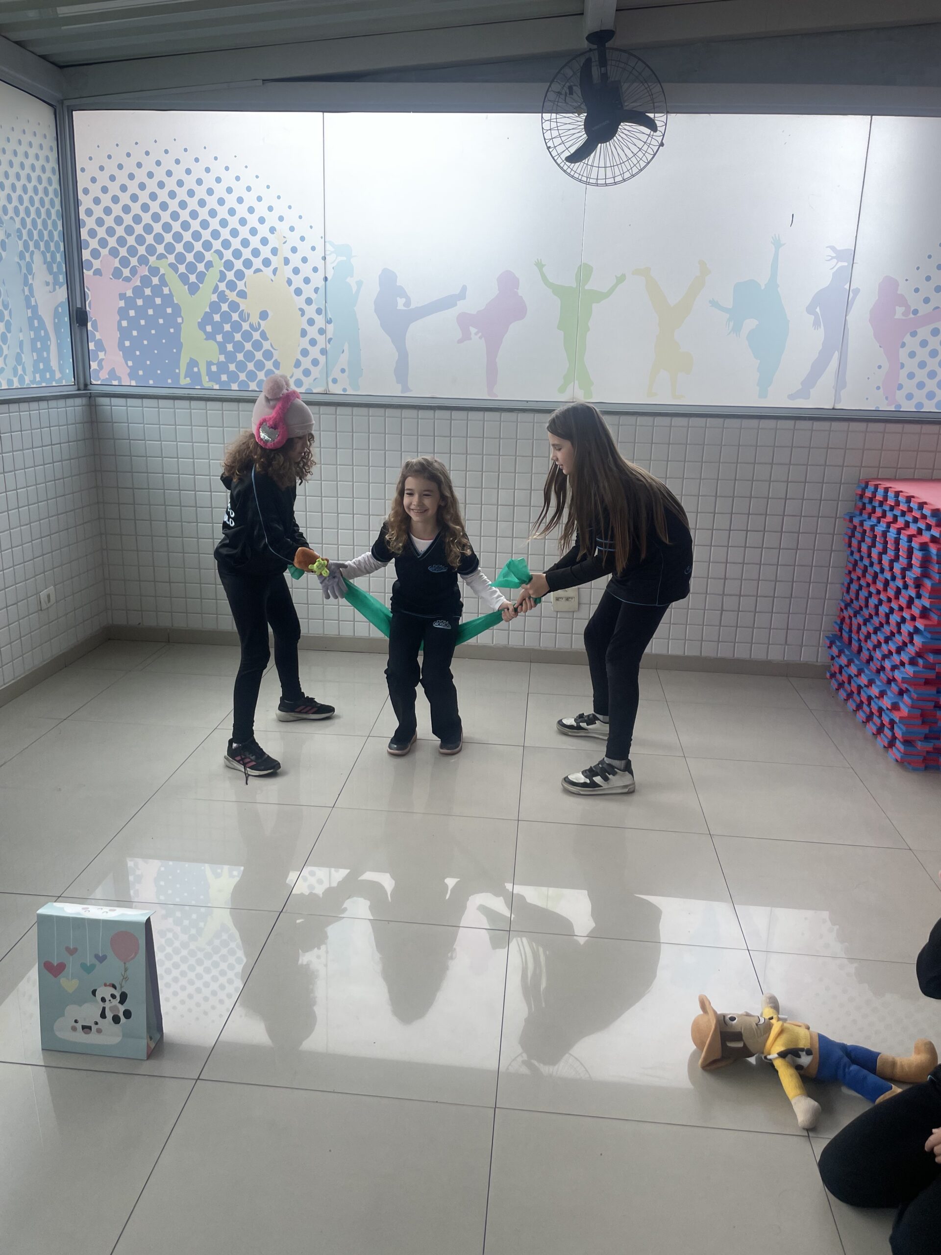 As atividades começaram com exercícios de relaxamento: massagem coletiva e técnicas de respiração para promover concentração e consciência corporal. Os alunos também exploraram o espaço da sala, tocando as paredes com diferentes partes do corpo conforme orientações da professora.